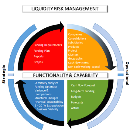 The fact is that one of the earliest lessons I learned in business was that balance sheets and income statements are fiction, cash flow is reality. Chris Chocola Finally – an unique set of liquidity management tools really do empower business and treasury to get it right.PowerStrat Liquidity Management Solutions provides specialised software and support to clients who would like to get better control of cash-flow and stop leakages from the cash flow system both in the short term on a daily basis to the long term on a monthly an annual basis. The methodology incorporates the short term cash flow forecasting to long term funding requirements and plans. The cash related items within the total organisation (not only treasury) are user driven and can also include non-cash working capital items to reflect working capital behaviour and position for comprehensive working capital management. Extrapolation of short and medium term budgets or scenarios into long term view (can be as long as 30 years) using comprehensive statistically driven predictive analytic methods to assess the business viability and sustainability from a funding as well as a performance perspective. This tool also provide assistance in the viability assessment of new strategies, projects or products. The ability to judge the affordability of annual budgets and the monitoring thereof against actuals and revised forecasts through the financial periods have never been easier. PowerStrat Liquidity software is a module that pulls data from your existing accounting systems and provides full independent liquidity risk management capability without affecting your data existing data. The dashboard components provide cut and dice perspectives from different components of the cash flow cycle. The software can be implemented as a pure strategic tool for determining funding requirements or performing viability assessment, or it can be implemented as an operational cash management tool which elevates into a strategic tool. The value of the software increases exponentially when it is incorporated into the cash management and budget monitoring and evaluation processes of the organisation. This is a highly practical everyday use tool for business units and head office treasury function. Services include: